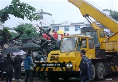 65T汽車吊在都江堰荷花池正大門旁在廢墟中成功救出幸存者